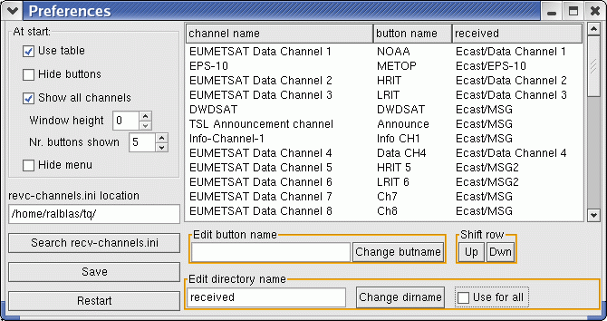 - To set one 'received' dir. for all channels: Select a line containing the correct dir. name or fill in the dir. in the "Edit directory name" field. Check "Use for all".